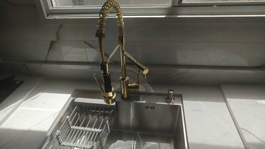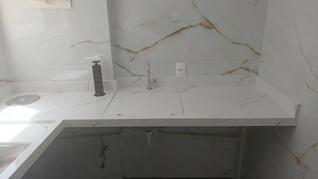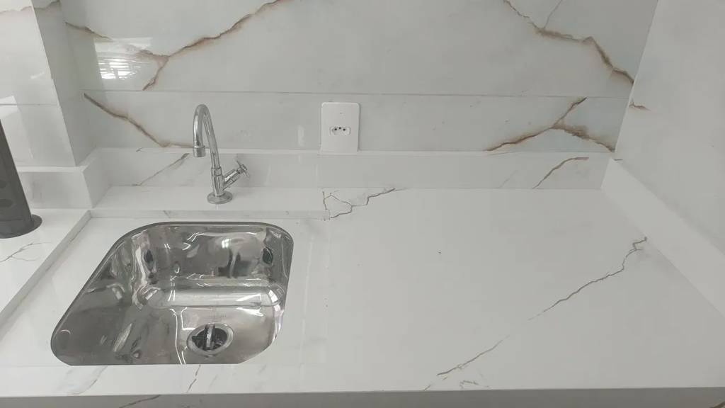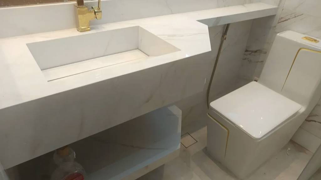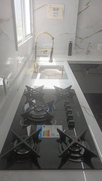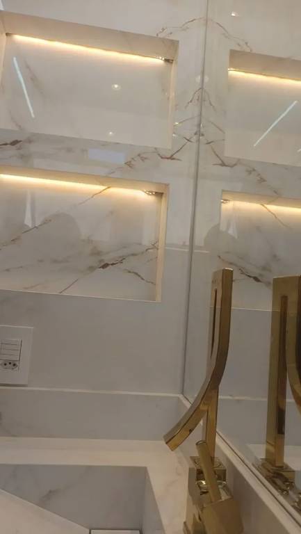 - Metais em acabamento dourado (torneiras, registros e ducha higiênica)